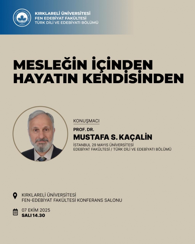 Kırklareli Üniversitesi Fen-Edebiyat Fakültesi Türk Dili ve Edebiyatı Bölümü tarafından “Mesleğin İçinden, Hayatın Kendisinden” başlıklı konferans düzenlenecektir.