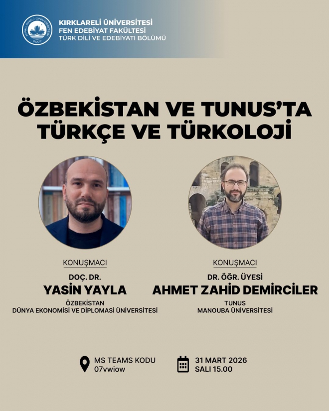 Kırklareli Üniversitesi Fen Edebiyat Fakültesi Türk Dili ve Edebiyatı Bölümü tarafından düzenlenen “Özbekistan ve Tunus’ta Türkçe ve Türkoloji” başlıklı etkinlik, Türk dilinin ve Türkoloji çalışmalarının farklı coğrafyalardaki gelişimini ele almak amacıyla gerçekleştirilecektir; etkinlikte Özbekistan Dünya Ekonomisi ve Diplomasi Üniversitesi’nden Doç. Dr. Yasin Yayla ile Tunus Manouba Üniversitesi’nden Dr. Öğr. Üyesi Ahmet Zahid Demirciler konuşmacı olarak yer alacak olup, 31 Mart 2026 Salı günü saat 15.00’te Microsoft Teams platformu üzerinden (katılım kodu: 07vwiow) gerçekleştirilecek programa tüm akademisyenler, öğrenciler ve konuya ilgi duyan katılımcılar davetlidir.